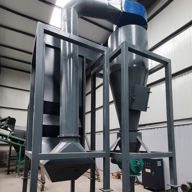 當(dāng)混有灰塵的顆粒物由送料設(shè)備送至空氣分選機(jī),顆粒物進(jìn)入空氣分選機(jī)后,利用空氣動(dòng)力學(xué)原理,把顆粒物打散,然后將灰塵和顆粒物分離,灰塵有旋風(fēng)除塵器送至卸料斗,顆粒物直接由重料出口料送至下一級分選設(shè)備,將顆粒物中的灰塵去除。
