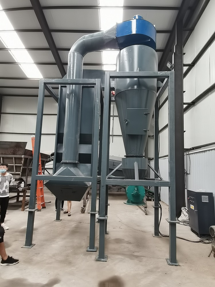 北澤楊機械廠的空氣分選機是利用空氣動力學原理,物料進入空分機后,利用空氣動力學把物料打散后將輕重物料分離,旋風除塵器把輕飄料送到卸料斗,重物料分離在空分機的底部,完成分選。
