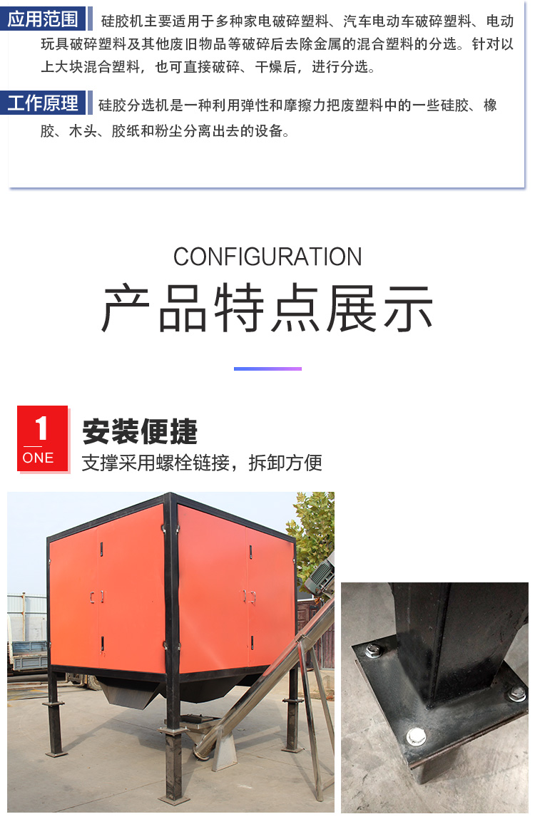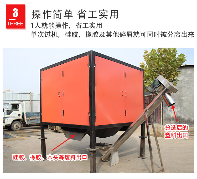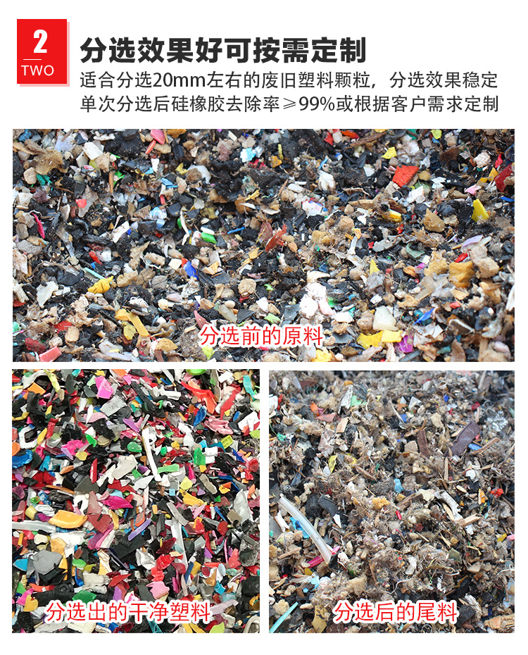 歡迎進入石家莊北澤楊官網(wǎng)! 硅膠分選機可以對廢舊塑料進行分選,一般用于廢棄塑料顆粒的提純,增加廢塑料的價值,該設備主要是利用彈性和摩擦力來把廢塑料中的硅膠、橡膠與其他雜質分離出來,完成對塑料的分選。